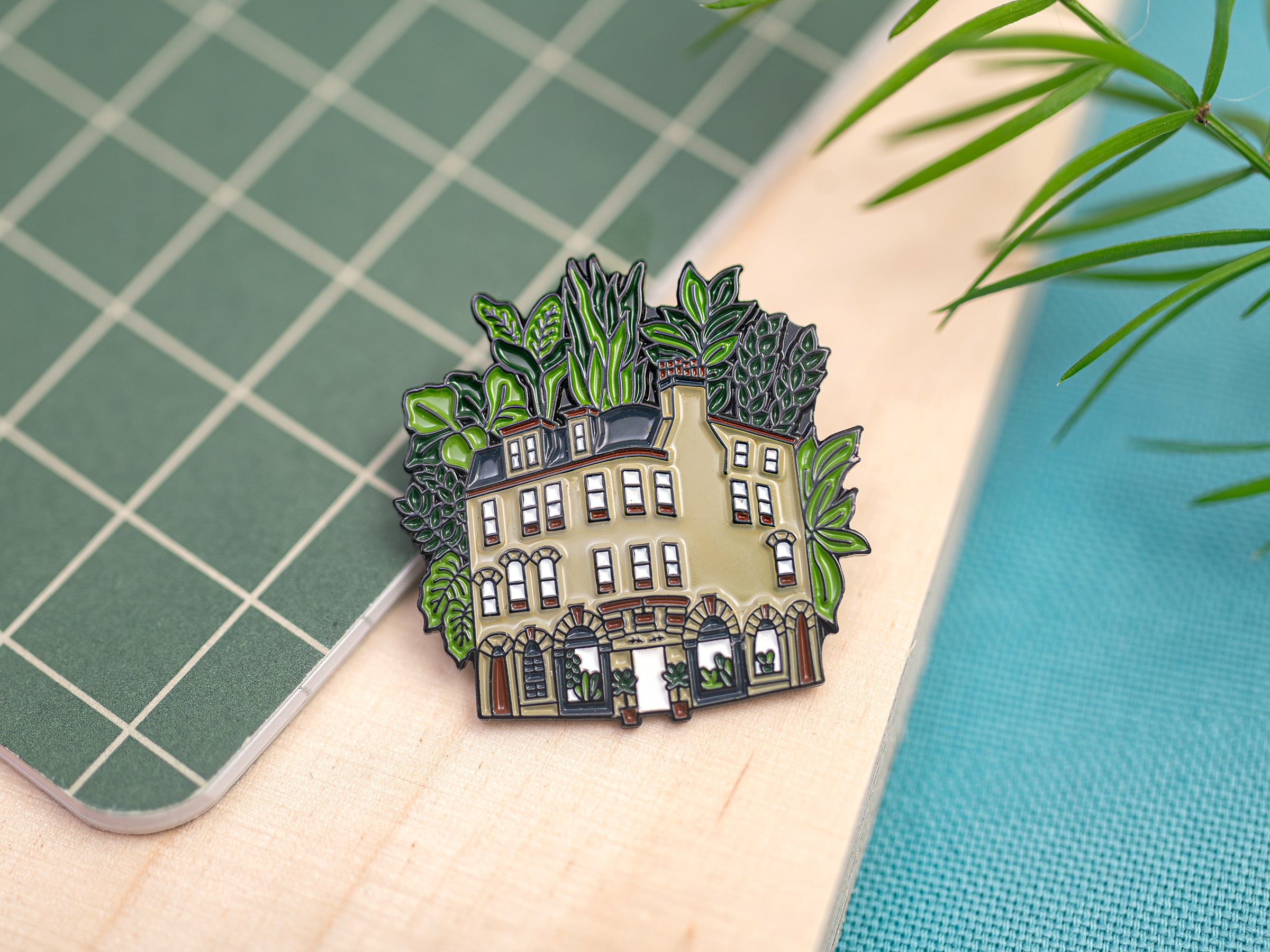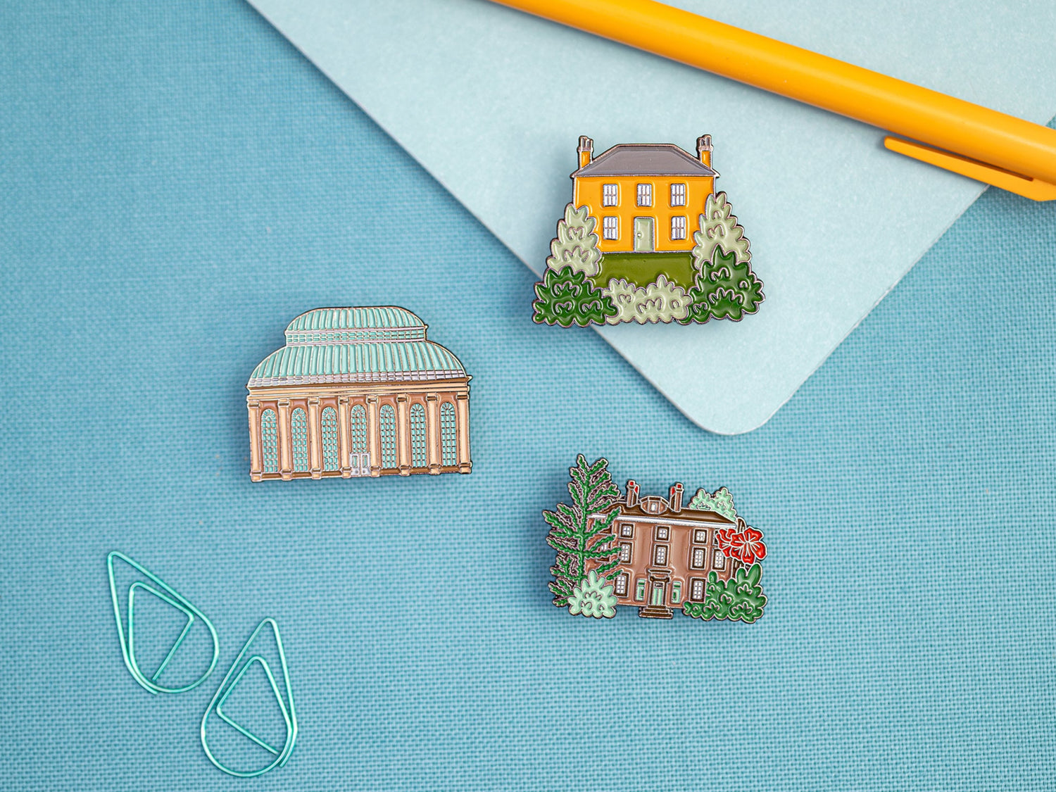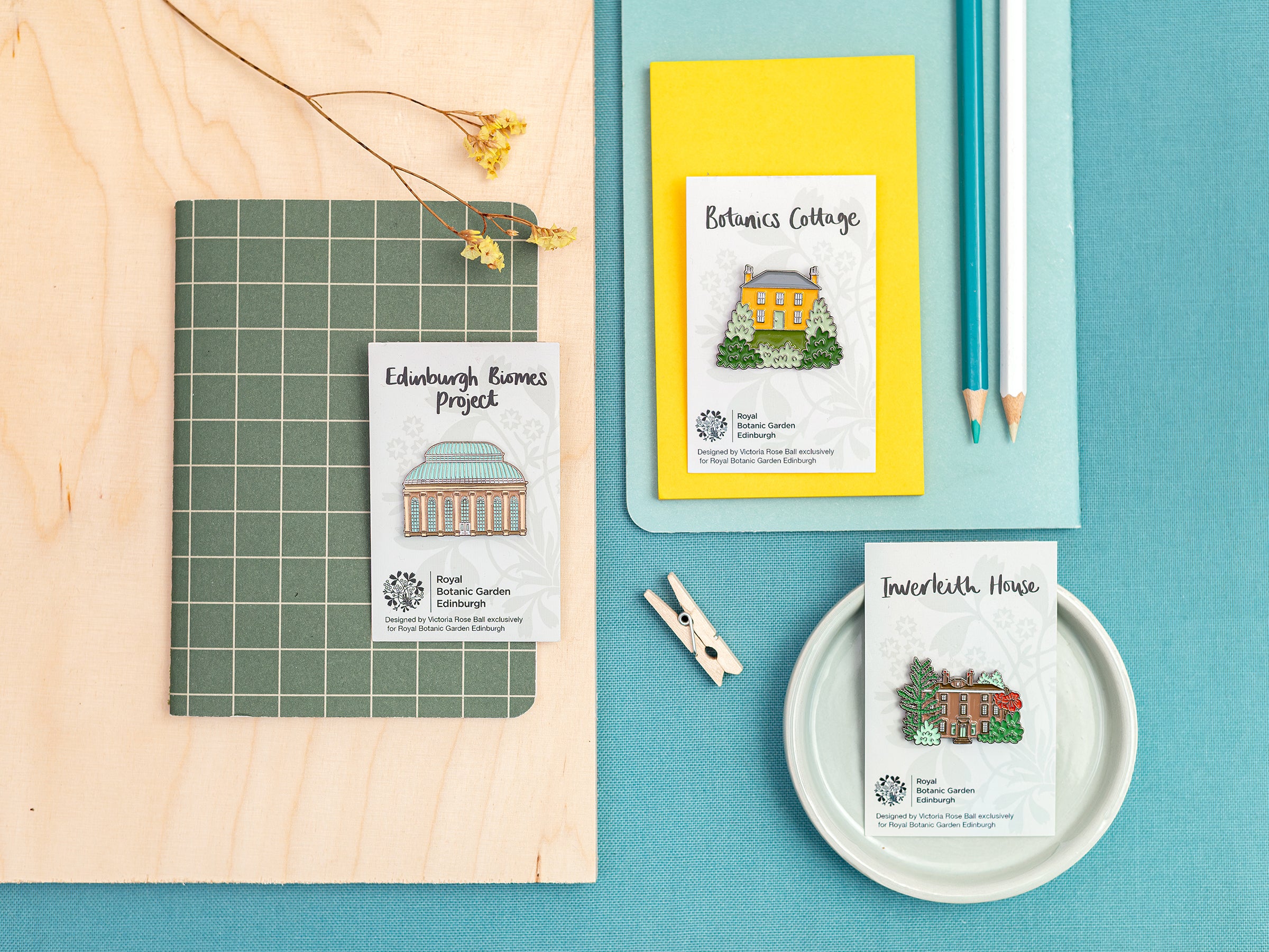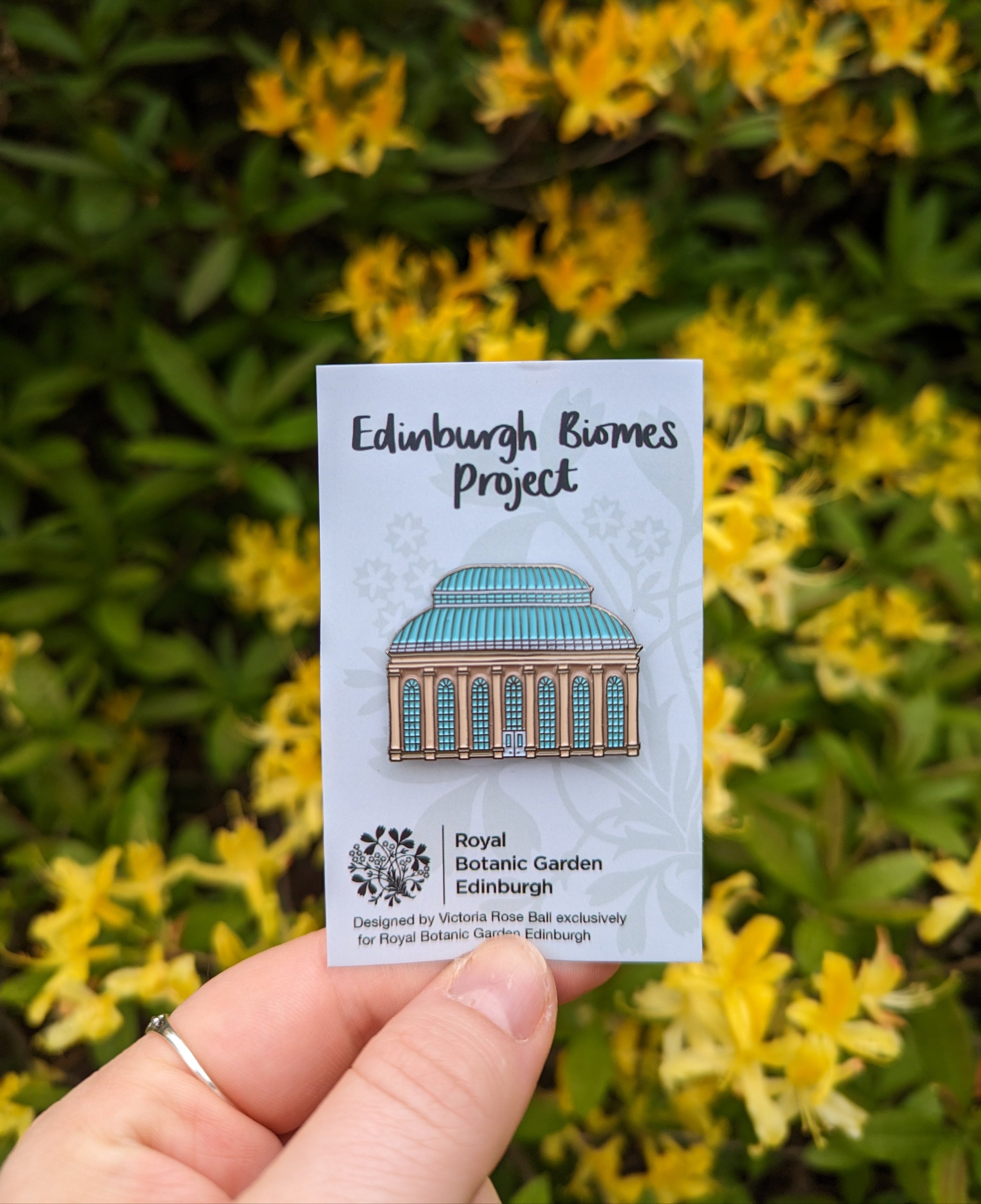 Pin badges created in collaboration with the Royal Botanic Garden Edinburgh - Inverleith House and the Botanics Cottage for sale in the Botanics Shop, while the Palmhouse design was created to support the ongoing restoration work of the Biomes Project.