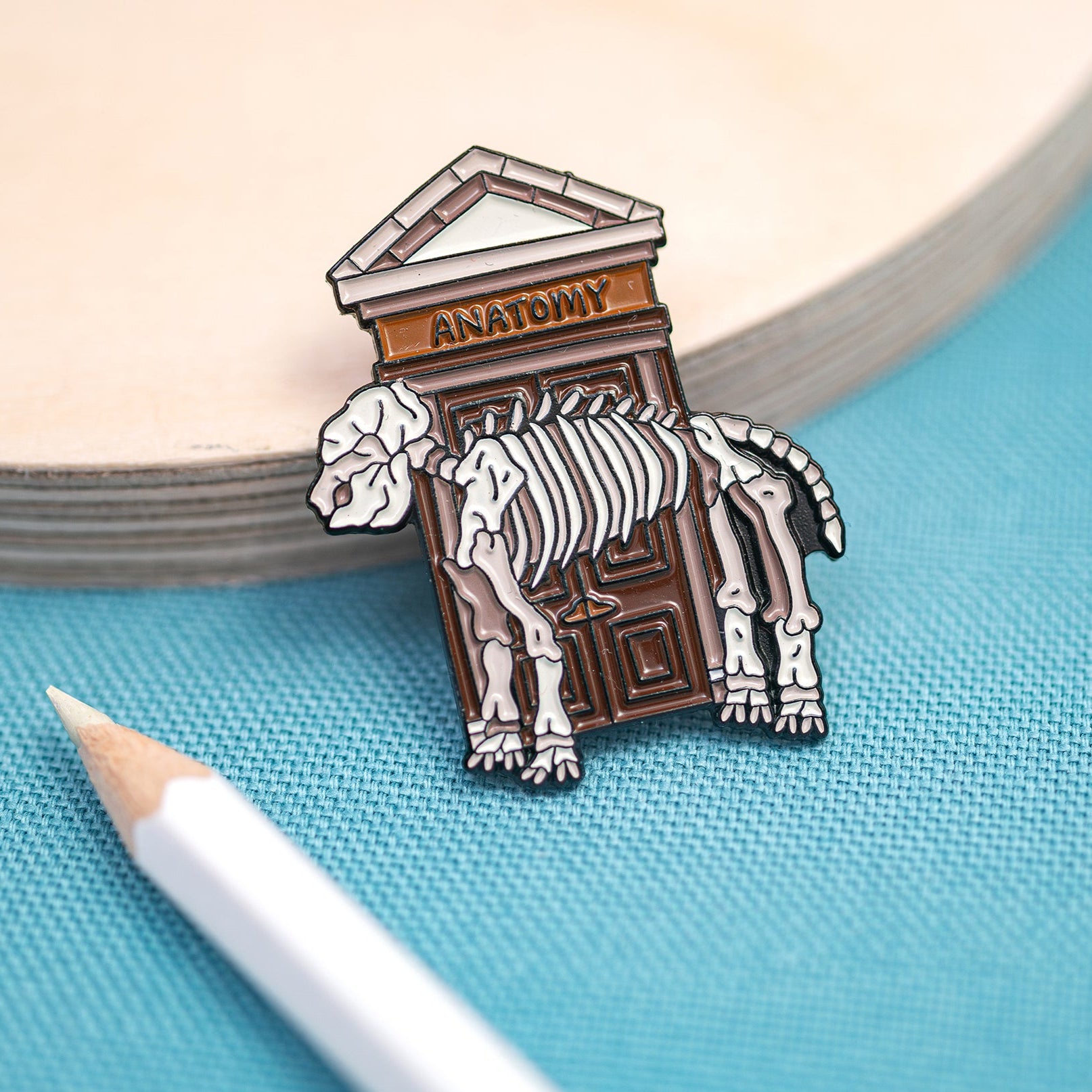 Pin badge designed created for the Anatomical Museum, featuring one of the infamous elephant skeletons that stand at the entrance to the doorway.