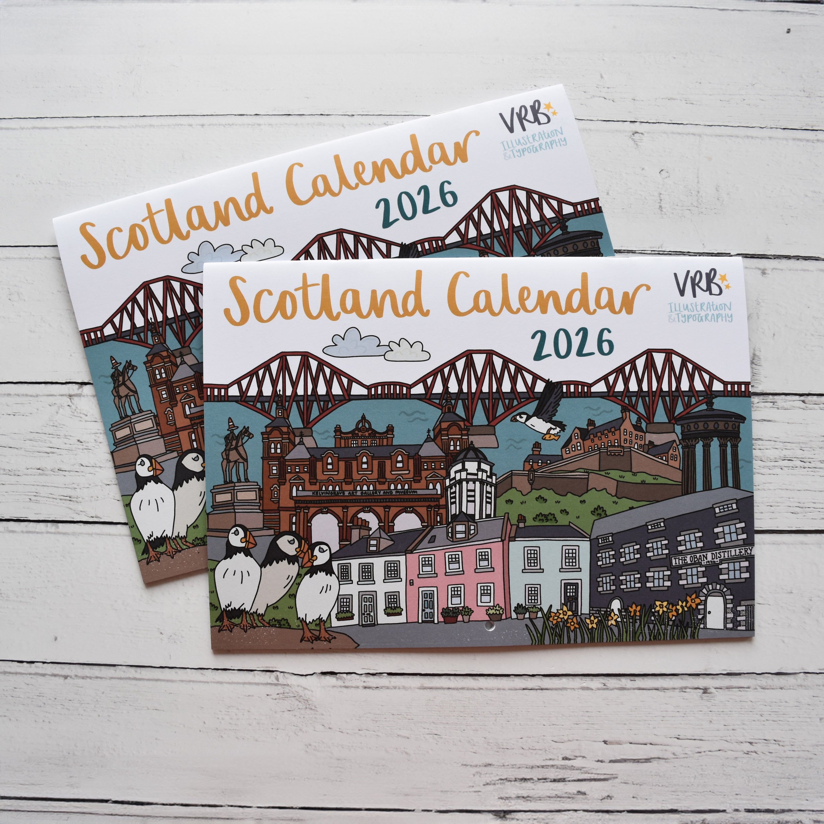 Supplied loose, plastic free. Featuring 12 illustrations across Scotland with large date pages for busy folk! Inside cover has a colouring page. A4 in size when folded. Printed in the UK.