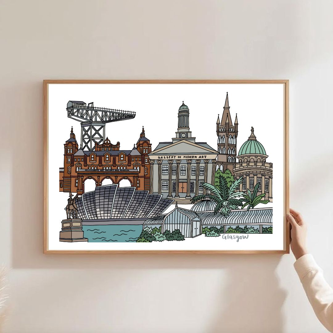This illustrated Glasgow Landmarks Print from Victoria Rose Ball features favourite landmarks from across Glasgow’s skyline, including Kelvingrove Gallery & Museum, GOMA, The Armadillo and of course the iconic statue of Duke Wellington.