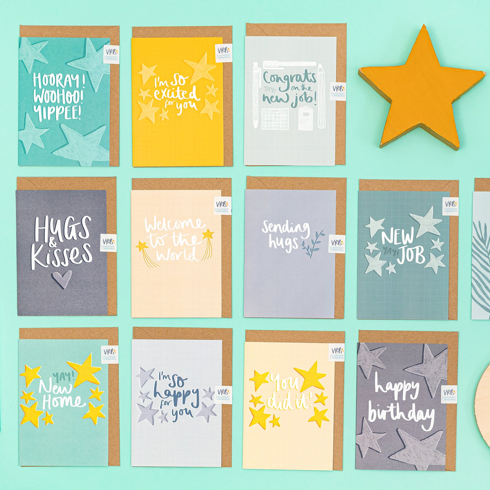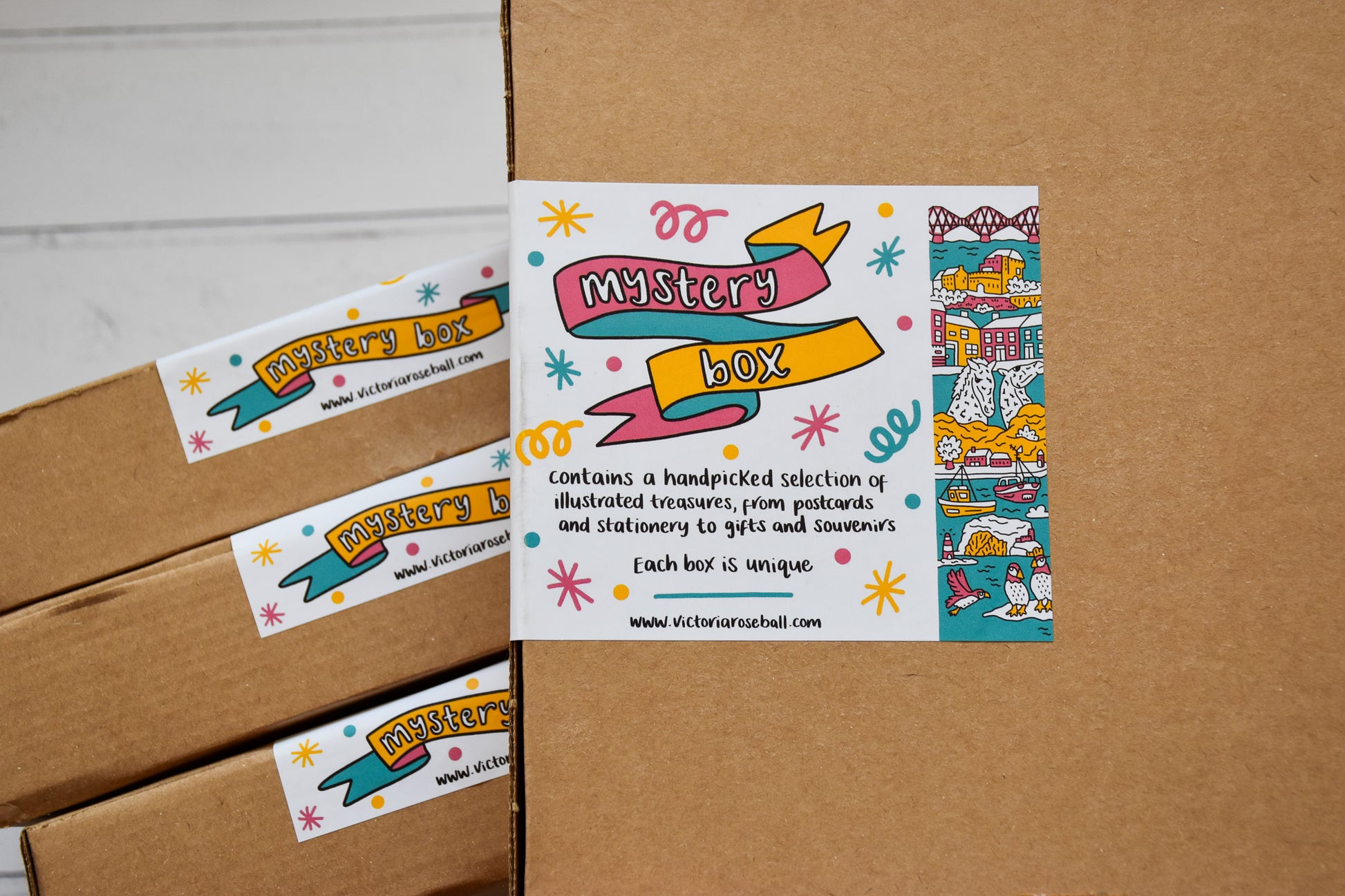 Contains a minimum of 5 cards (illustrated and greetings cards), a minimum of 3 illustrated postcards, at least 1 magnet, an item of stationery, gift wrap, and more!