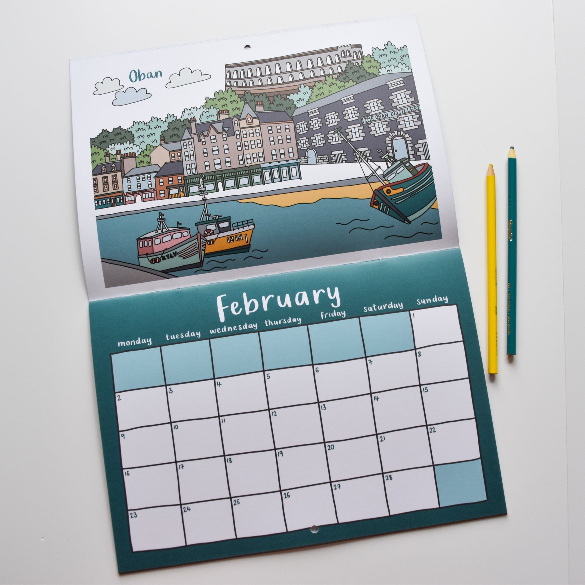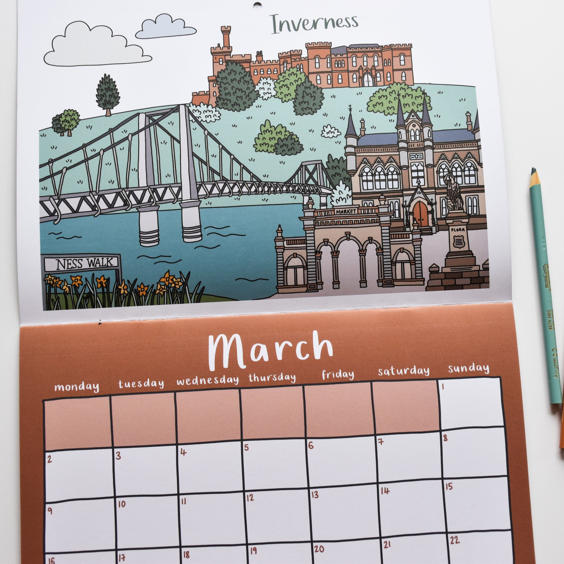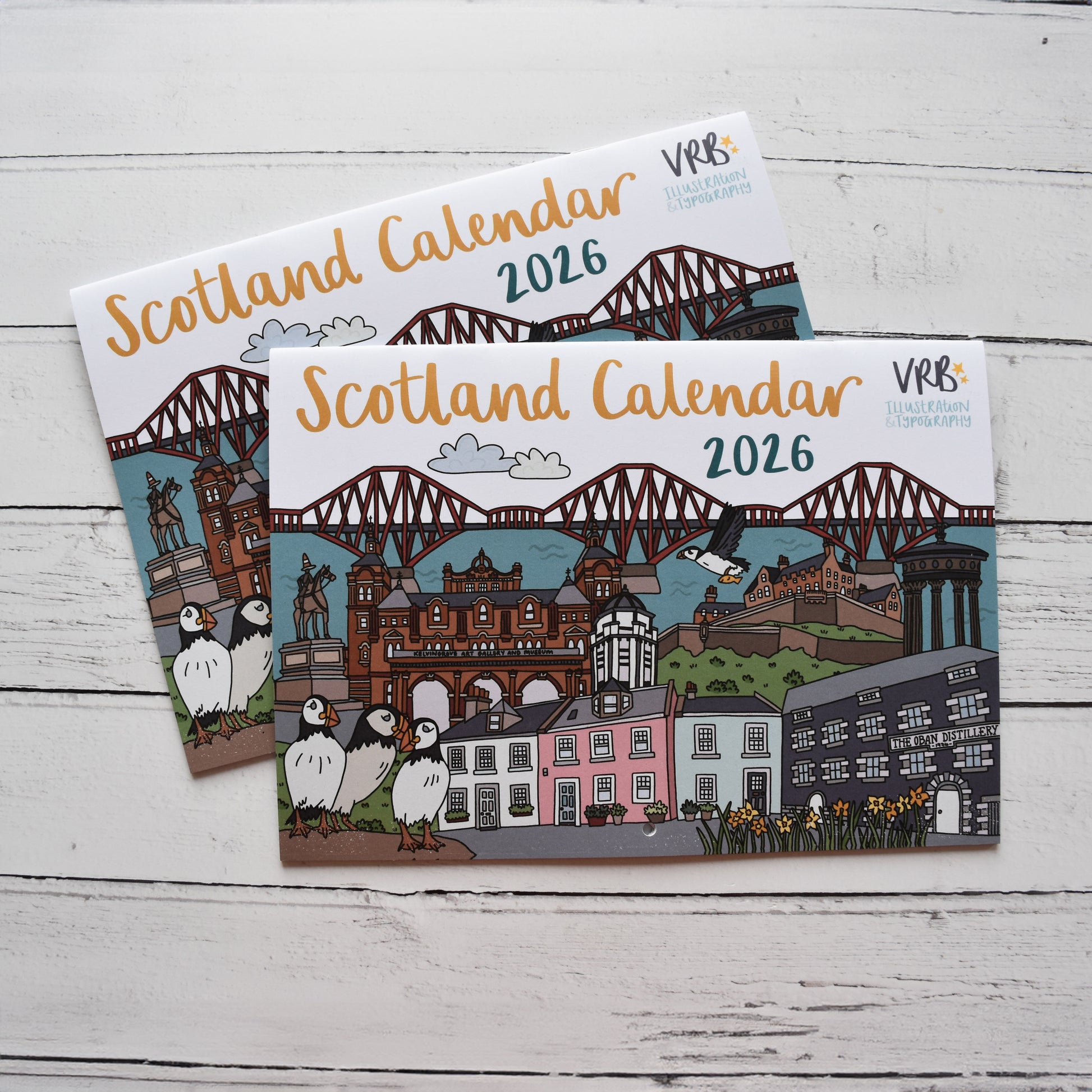 2026 Calendar featuring 12 illustrations across Scotland - including Edinburgh, Glasgow, Inverness, Aberdeen, St Andrews, Oban and John O’Groats.