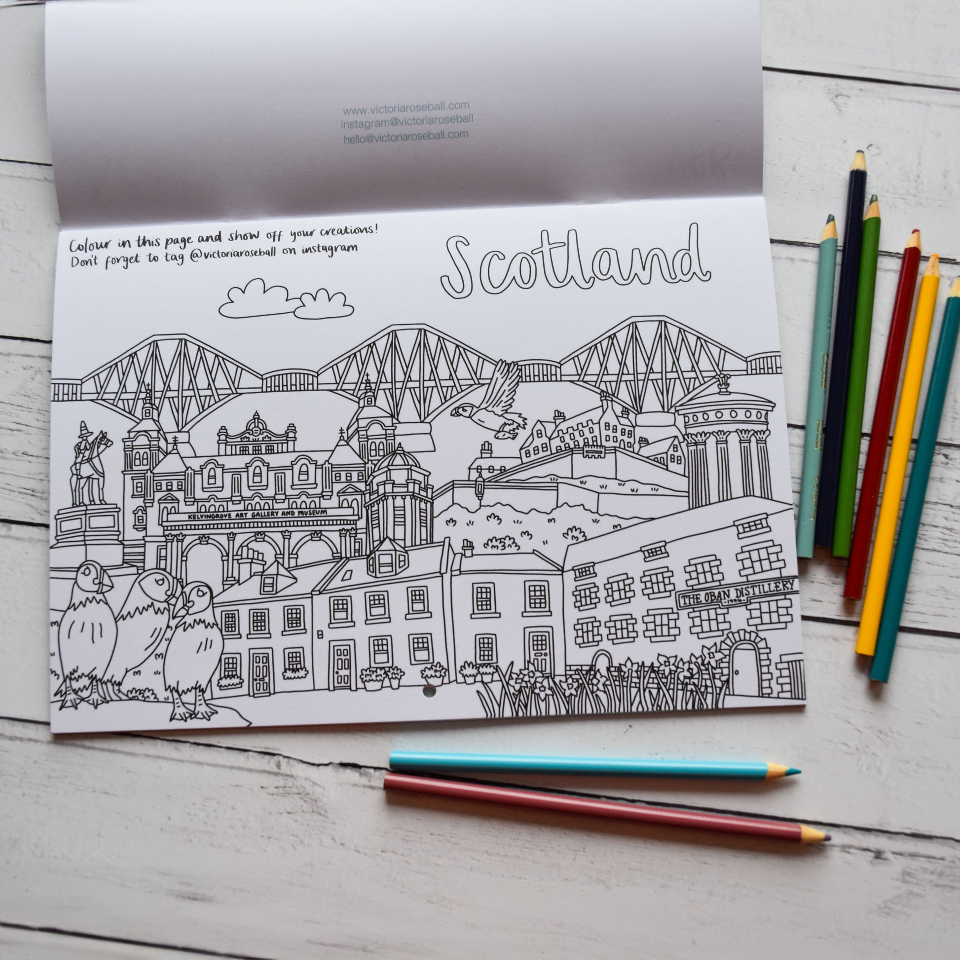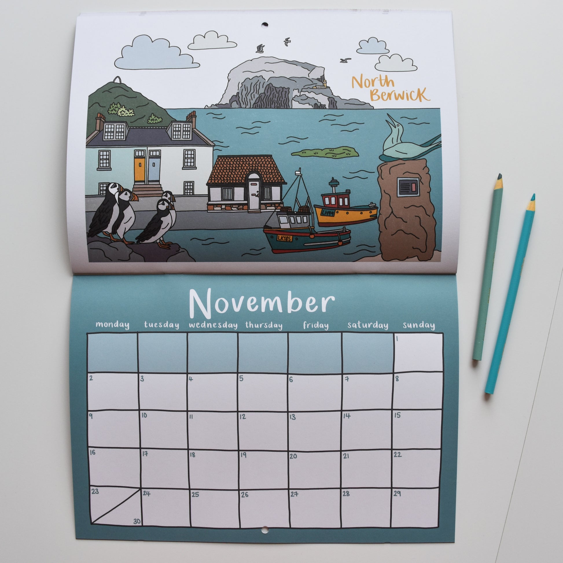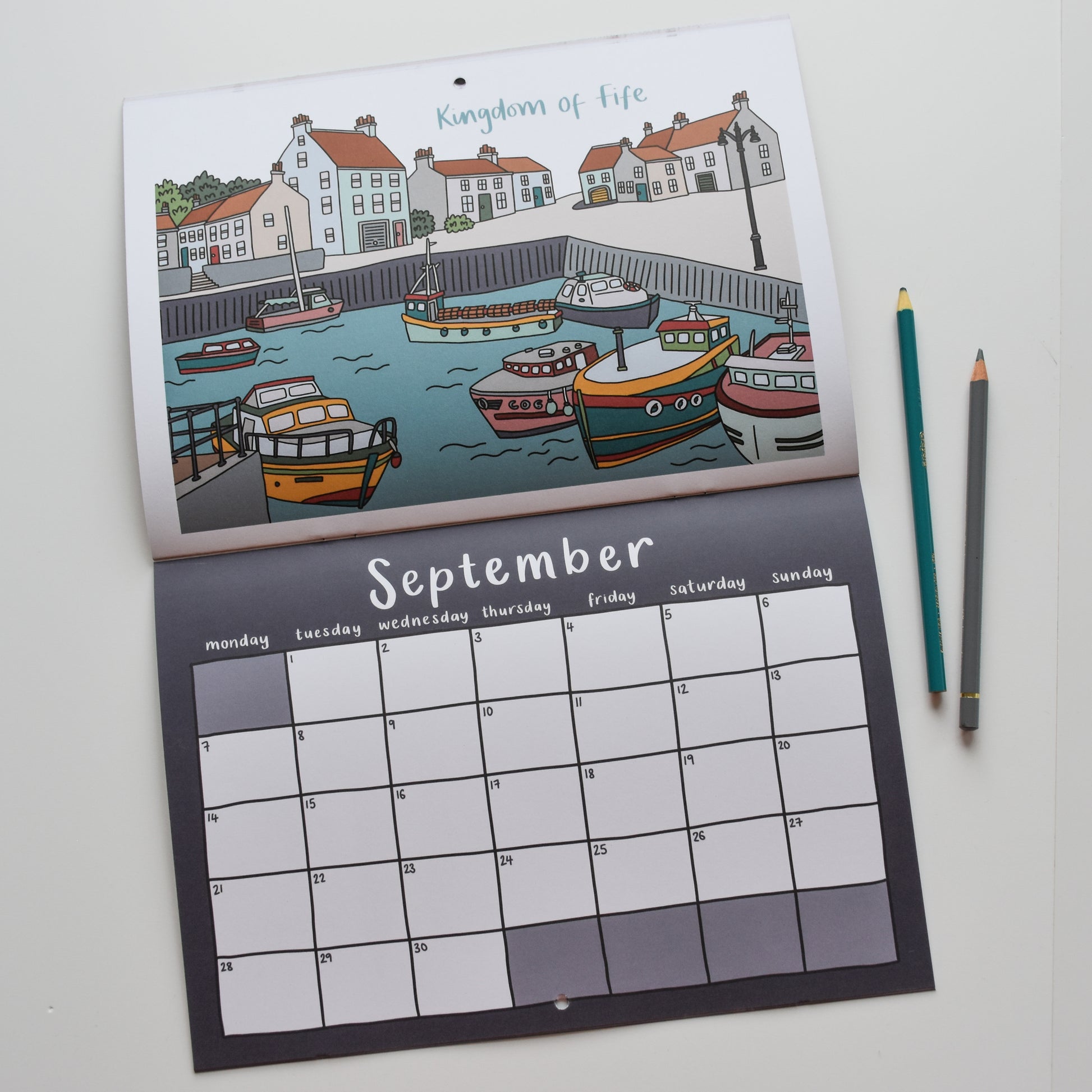 2026 Calendar featuring 12 illustrations across Scotland - including Edinburgh, Glasgow, Inverness, Aberdeen, St Andrews, Oban and John O’Groats.
